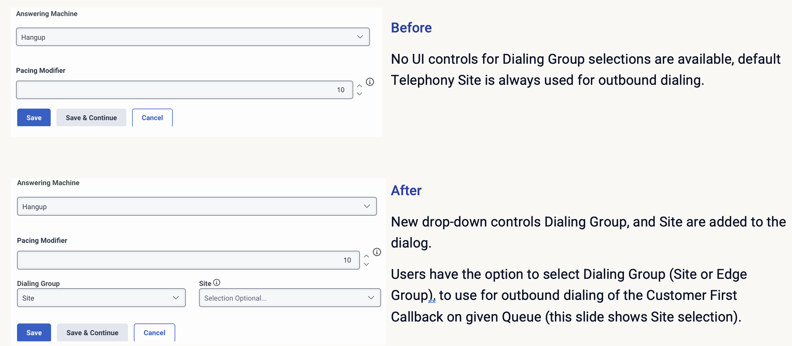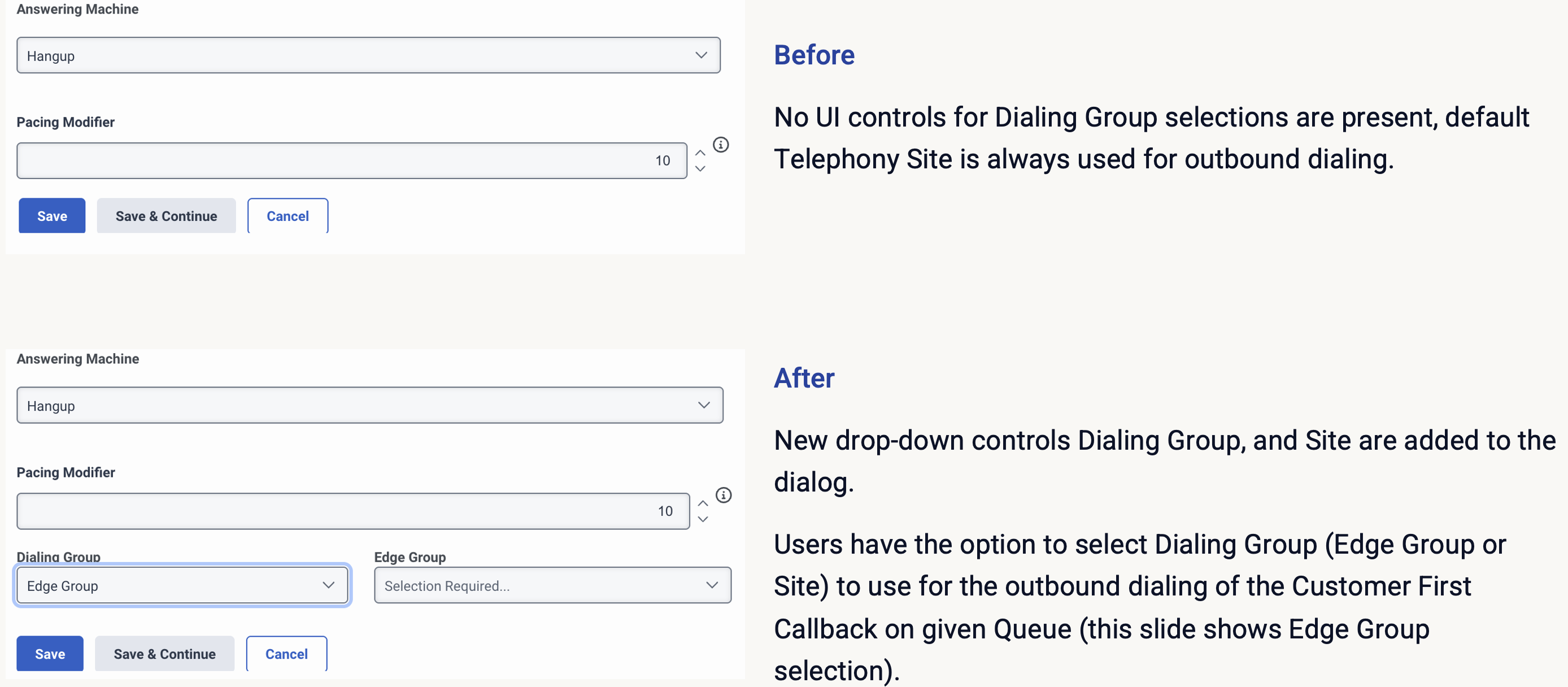 如果选择了拨号组,系统将使用该站点或边缘组从该队列进行出站回拨。如果未做出选择,系统将继续使用默认电话站点,保留当前行为。