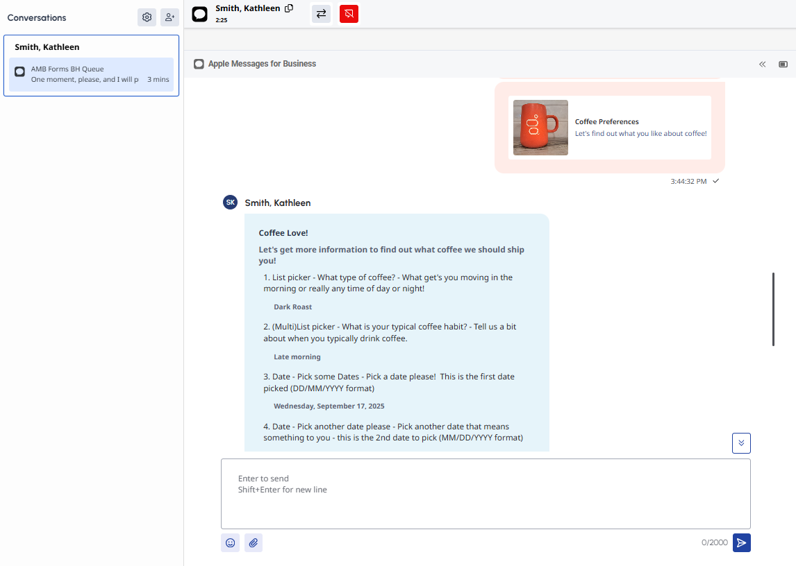 - 客户提交的表单回复出现在消息记录中,为代理提供交互的无缝视图。