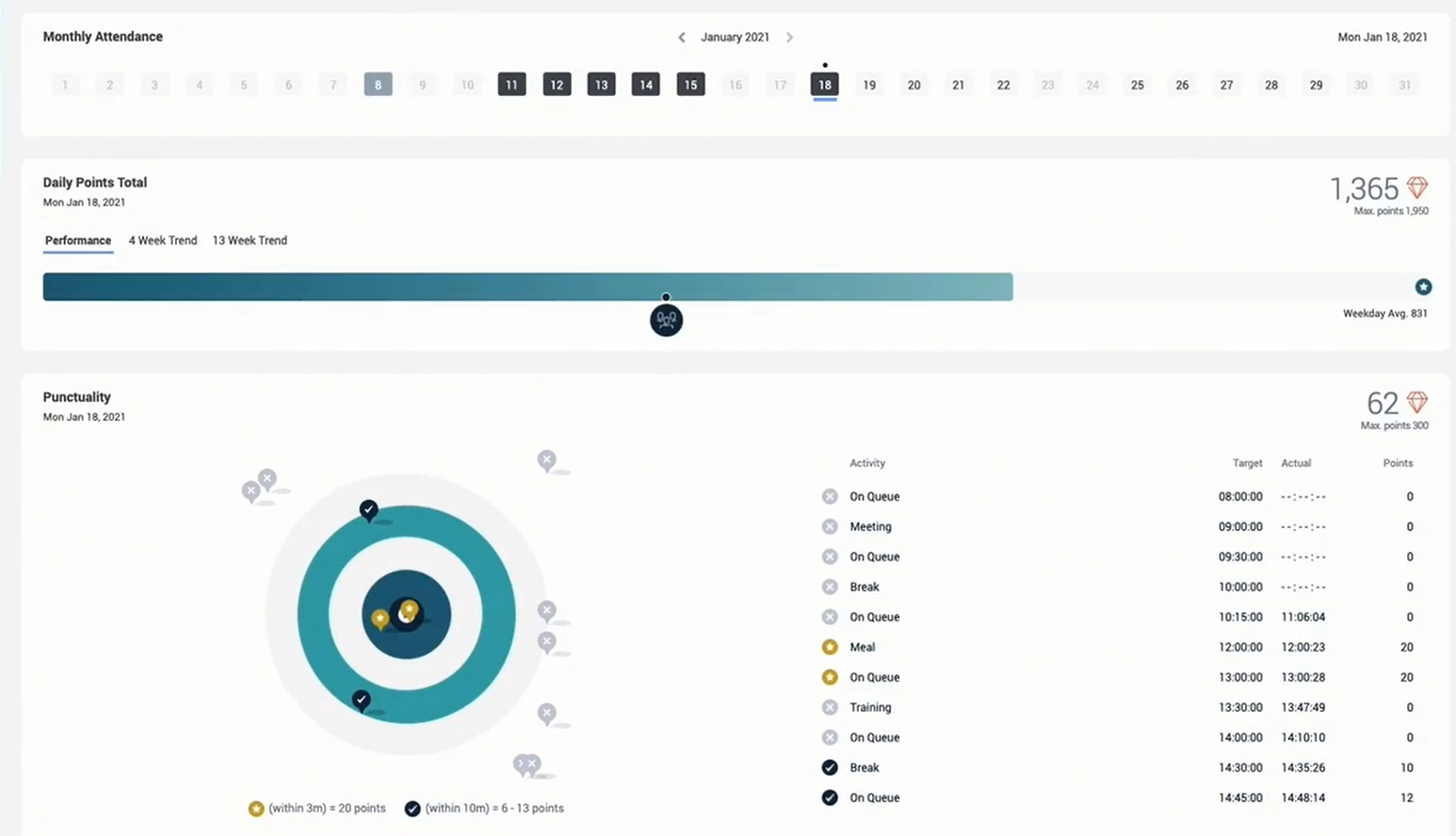 游戏化将您基于绩效的目标转变为旨在推动您的座席的绩效点和指标。 指标通过记分卡和排行榜呈现给座席和主管 代理活动概述.