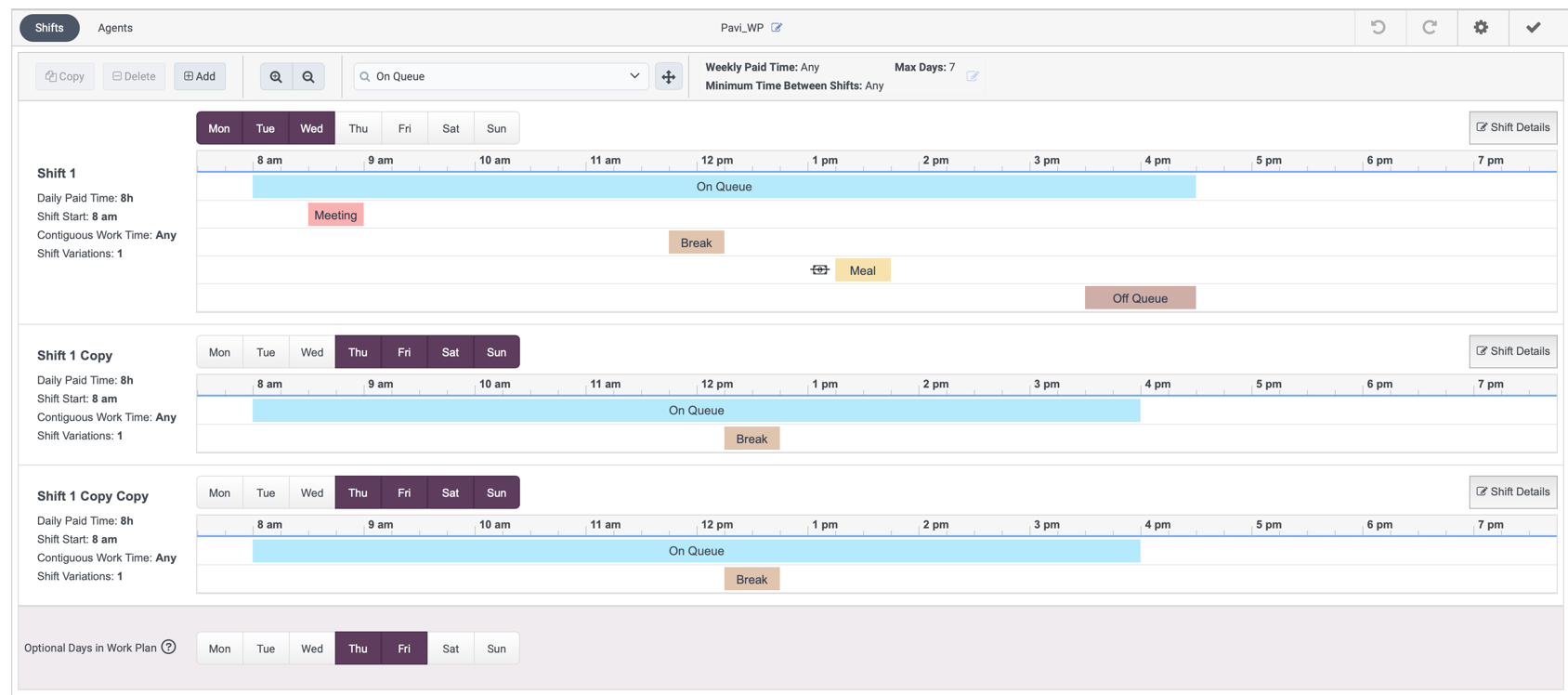 工作计划页面显示遵守工作计划的代理的轮班详情。 单击图像可放大。