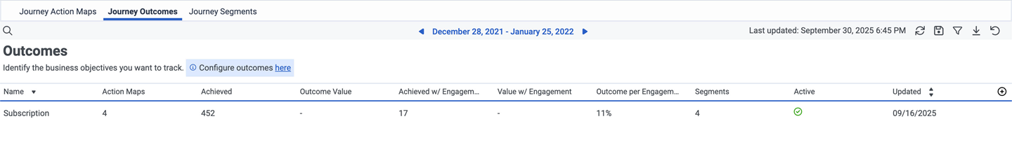 旅程结果报告提供了结果的表现。 利用有关结果绩效(有参与和不参与的情况)以及影响结果的行动图和细分市场的可用信息,您可以配置结果以满足您的业务需求。