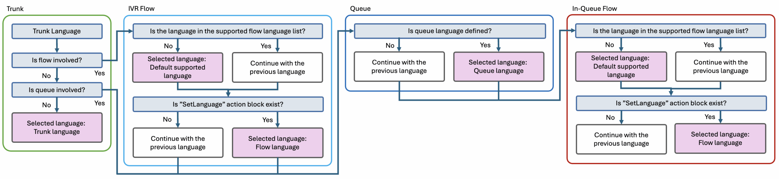 Genesys Cloud 分四个阶段确定来电的媒体语言。在每个阶段,系统都会评估配置设置,并根据可用上下文更新当前语言值。