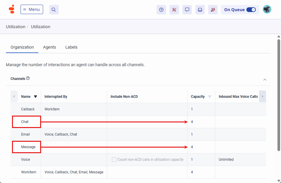 当您从 Web 聊天迁移到 Web 消息传递时,座席会回答不同类型的交互。 对于这两个渠道,Genesys Cloud 都为管理员提供了在组织级别或代理级别定义代理利用率的选项。 这些选项决定了每种媒体类型的座席处理的交互次数。