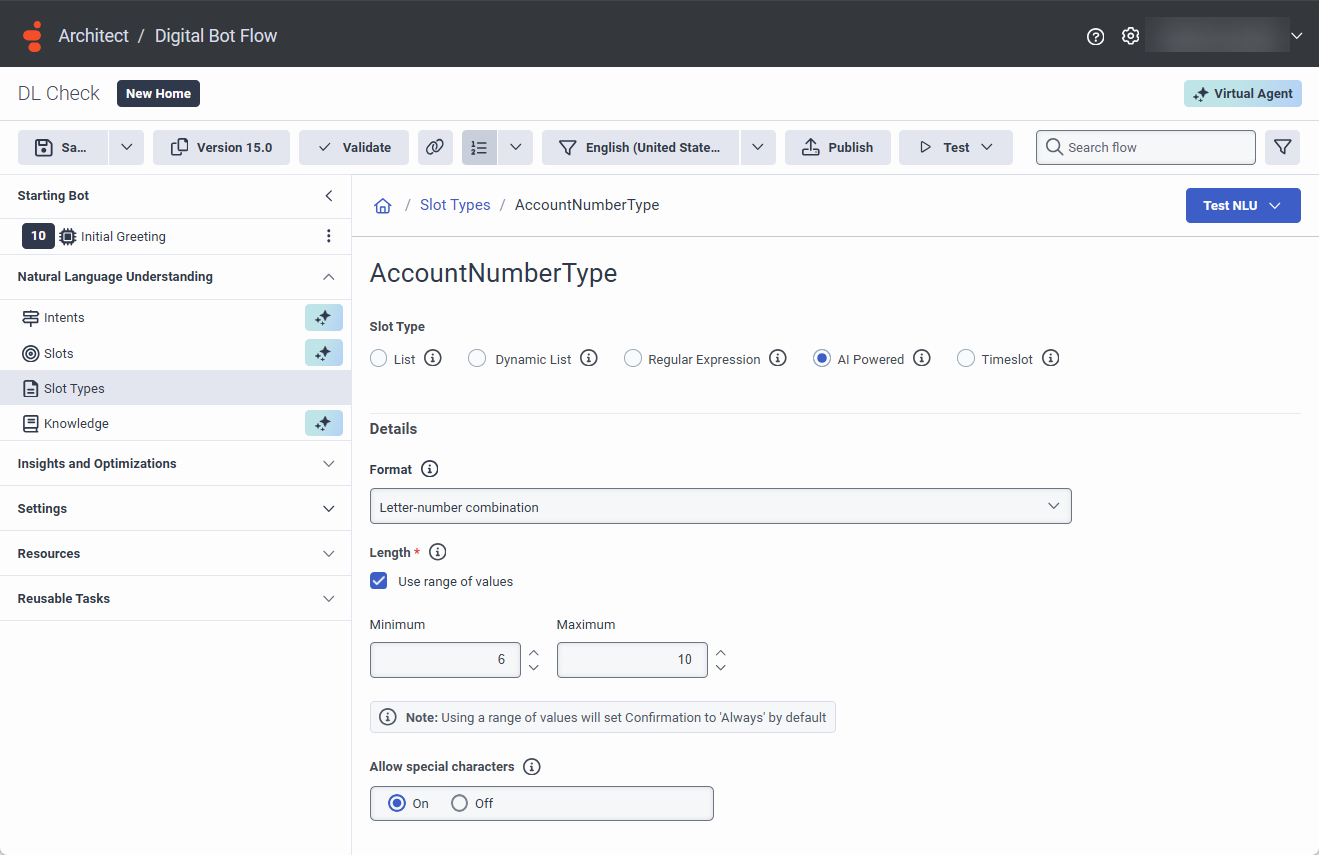 - 选择使用值范围并将字符长度设置为一个范围。如果插槽有长度范围,Architect 会自动将“询问插槽”操作的确认模式设置为“始终”。