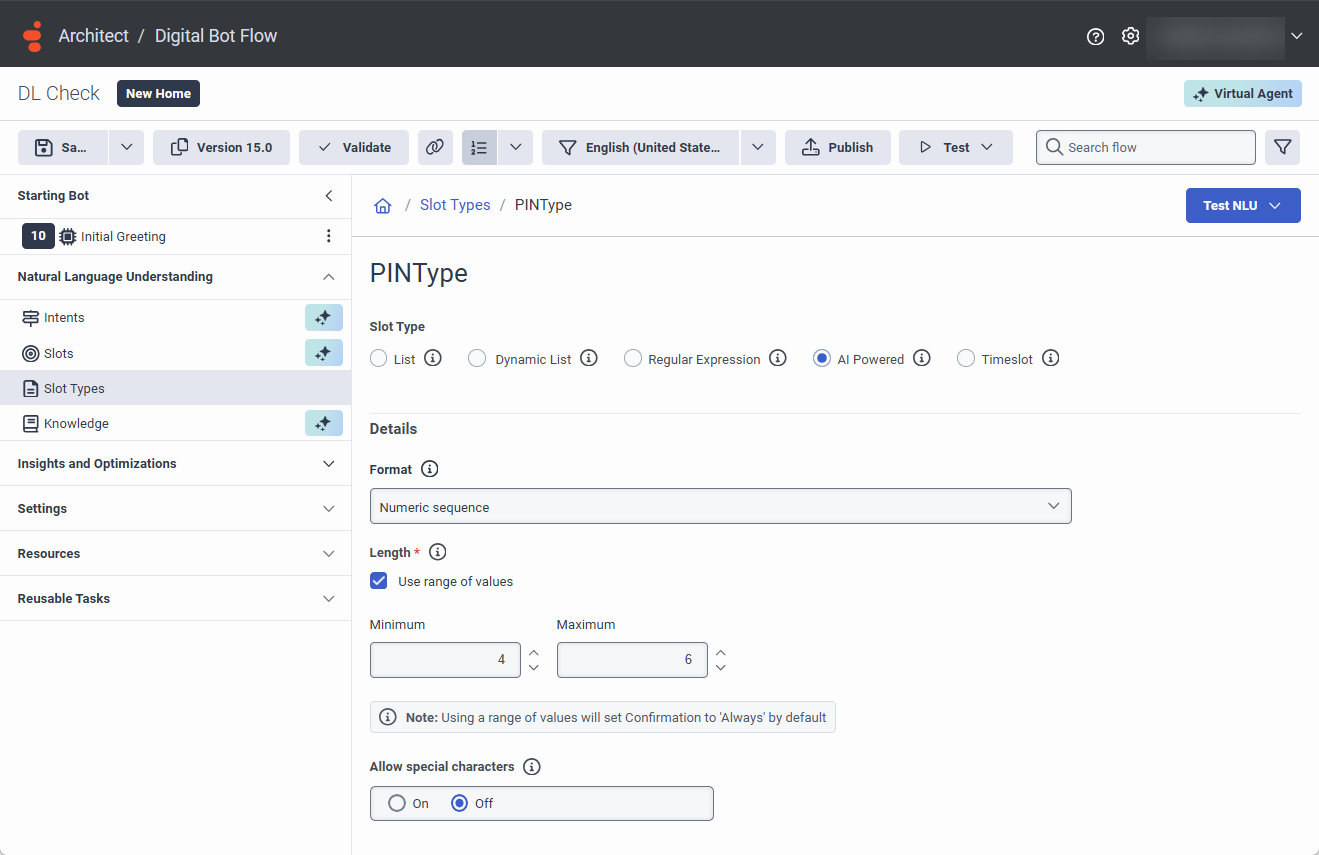 - 创建新的语音或数字机器人流程或打开上一个,然后导航至自然语言理解>插槽并打开AI驱动的插槽类型来增加价值。