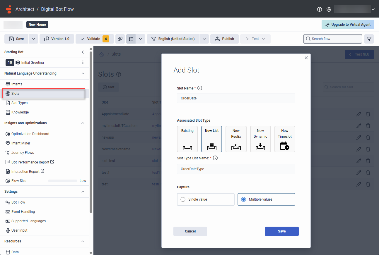 - 在“捕获”下,选择插槽是否必须捕获单个值或多个值。选择多个值如果您打算在允许多选的列表选择器中使用列表槽类型。
