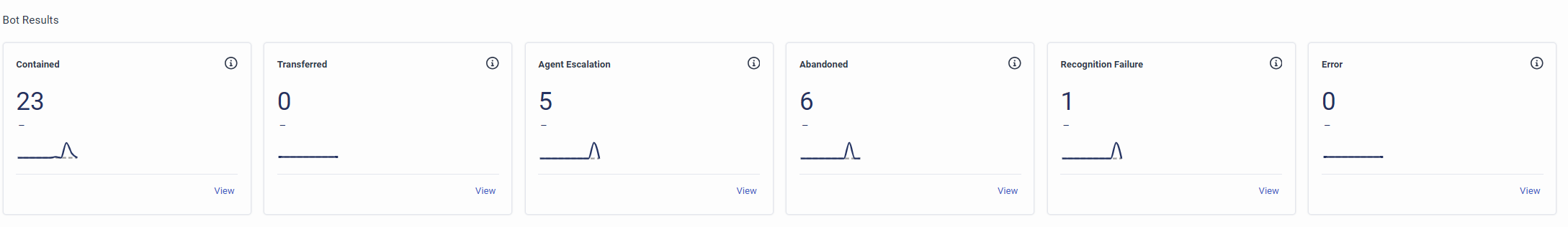 - 要打开机器人对话库,您可以在其中查看与特定机器人结果相关的对话列表,请单击看法在任何这些图块下方。 查看详细信息,例如会话 ID、机器人结果、发生日期以及结果原因。