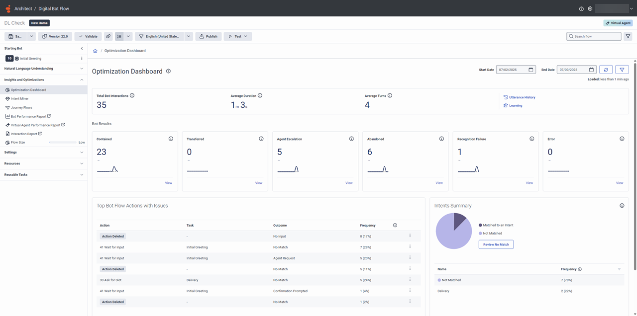使用 Architect 中的 “优化” 仪表板查看所选 Genesys 对话引擎机器人流程或 Genesys 数字机器人流程的性能和高级操作指标。 这些数据可帮助您改进机器人流程并对其进行故障排除。 您也可以通过指定日期范围或配置的语言来筛选这些结果。