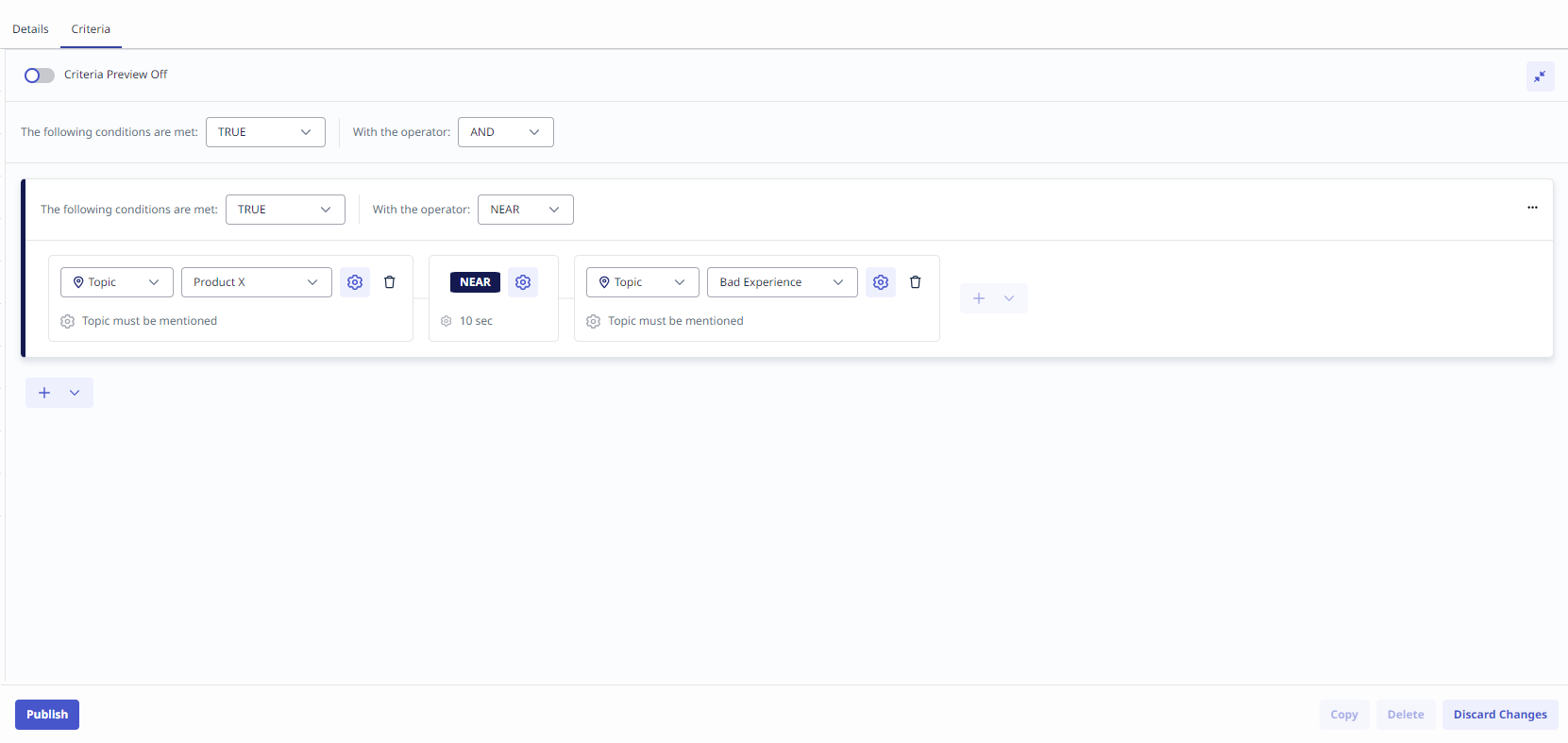 至少发现: 为了使操作数为真,必须找到主题的最少次数。 如果未达到最低要求,系统将按照未找到该主题的方式继续操作。 未找到: 要使操作数为真,一定找不到主题。 它定位不包含特定主题的交互。 注意: 使用 NEAR 运算符时,第一个操作数必须设置为 Found,第二个操作数可以设置为 Found 或 Not Found。 |
